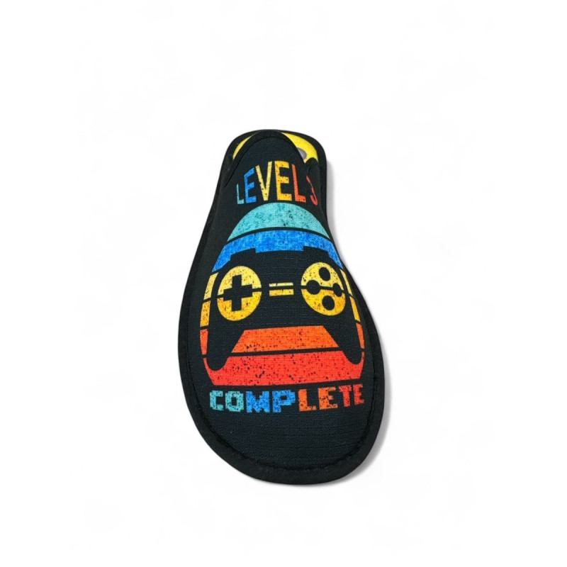 Zapatilla de casa primavera, verano para chico. Fabricada en Arnedo La Rioja. Suela de caucho antideslizante, plantilla normal gruesa acolchada y extraíble. Tejido transpirable serigrafiado permanente de estampado moto. Calce de talla normal.