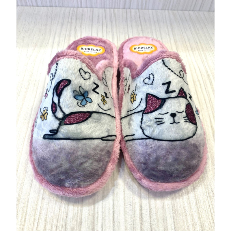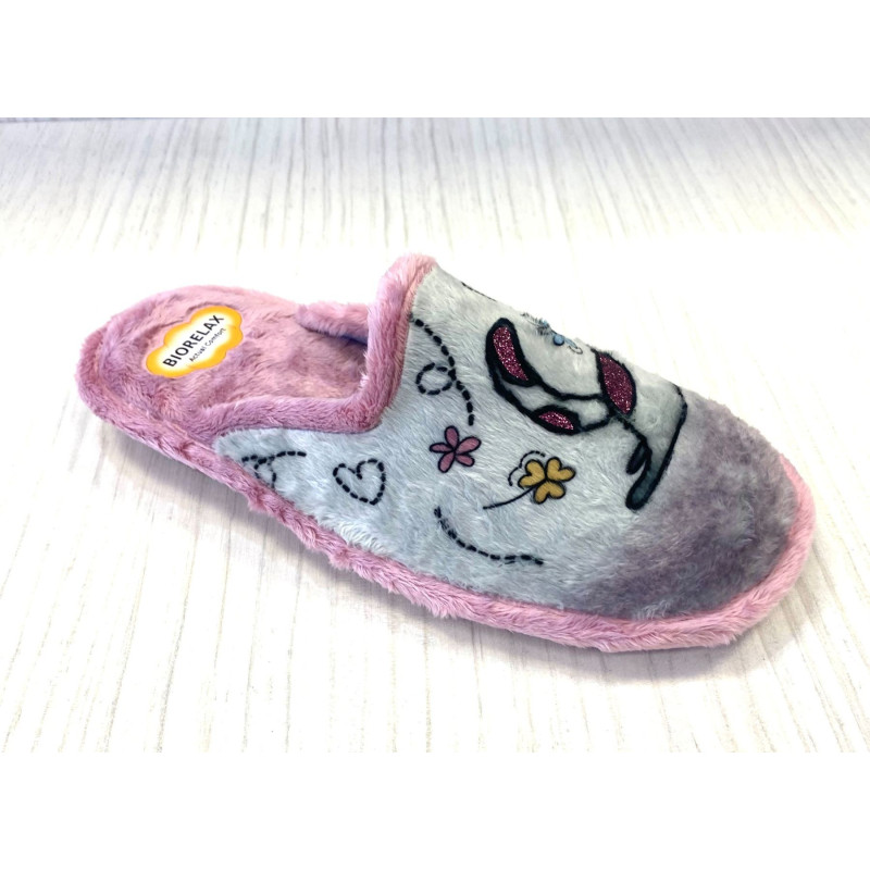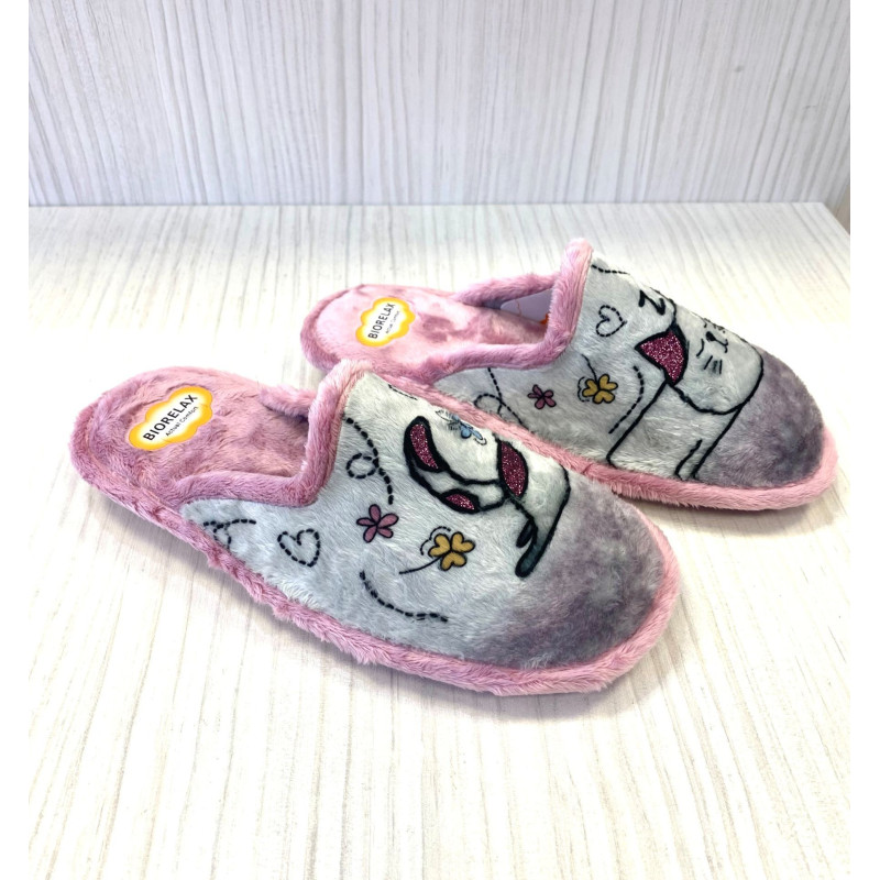 Zapatilla de casa para mujer, de la marca Cosdam en color gris. Fabricada en España en material textil de primera calidad. Diseño bonito y alegre. Plantilla color rosa, con efecto Biorelax para ofrecer máximo confort en cada pisada, con la palabra 'Biorelax' grabada. Suela de goma antideslizante, que ofrece un buen agarre al piso. Calce normal.