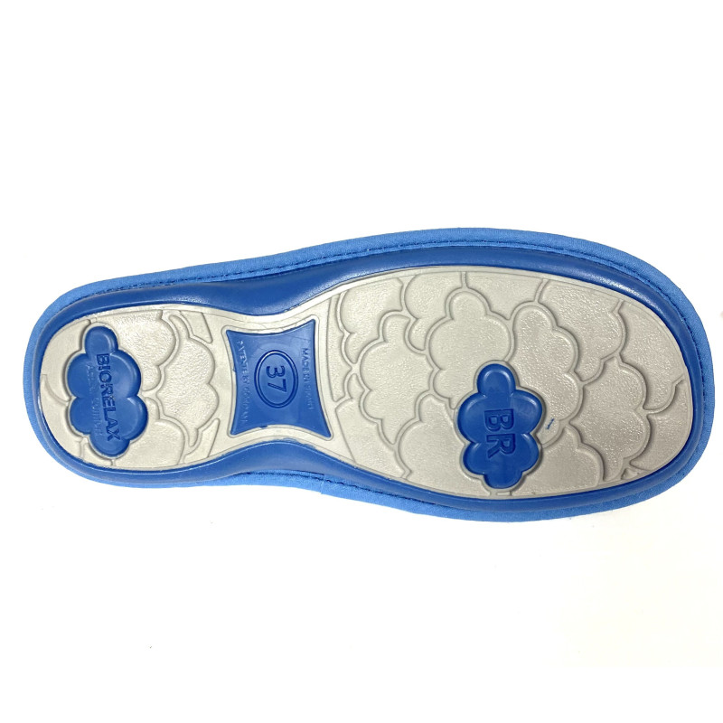 Zapatilla de casa de la marca Riojana Cosdam Biorelax. Fabricada en tejido suave, plantilla muy acolchada, suela de caucho antideslizante. Detalle de pelo largo en el empeine. Hecho en España.