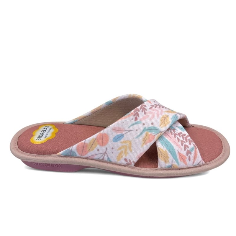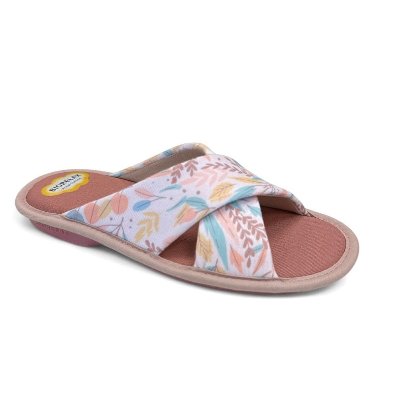 Zapatilla de casa para mujer de la marca riojana Cosdam Biorelax. Fabricada en tejido de alta calidad transpirable tipo rafia con estampado de flores. Corte cerrado en la pala y abierto por detrás. Este modelo se caracteriza por su apoyo plantar con colchón viscoelástico de alta densidad de alta recuperación, en ella sentirá que flota. Cuidara el confort descansando en estas super zapatillas. Suela realizada en caucho natural totalmente antideslizantes muy cómoda. Calce normal, recomendamos elegir su talla habitual o si tiene dudas la supperior. Hecho en La Rioja.