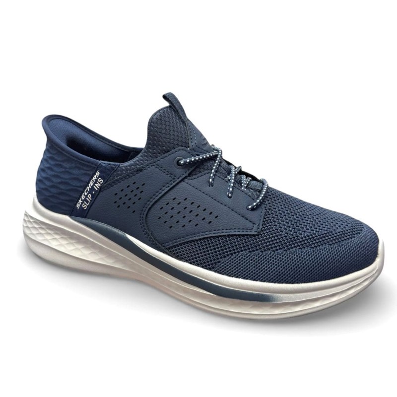 Zapatilla Skechers deportiva de verano transpirable para hombre con sistema Slip Ins. Apuesta por la máxima comodidad a la hora de caminar con Skechers Slip-Ins® Relaxed Fit®: Slade - Quinto. Este modelo con cordones elásticos, diseñado con nuestro exclusivo sistema Heel Pillow, cuenta con una parte superior de tejido knit técnico transpirable, una plantilla Skechers Air-Cooled Memory Foam® con infusión de carbón y la amortiguación Skechers Goga Mat Arch™, que ofrece un mejor soporte. Calce de talla amplio si está entre dos tallas no elegir la talla más grande.