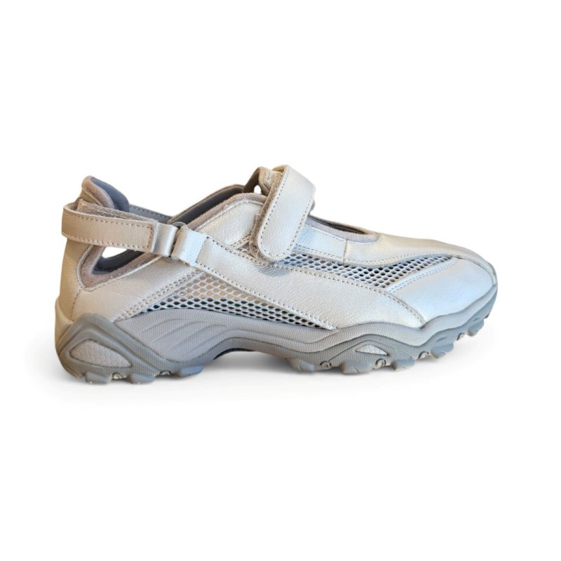 Deportivas semiabiertas para pies delicados de mujer. Fabricadas por la marca Alemana Gcomfort, especializados en calzar los pies mas exigentes. Confeccionada en piel napa gris metal suave. Sistema especial de plantilla de piel acolchada extraible con posibilidad de poner ortopédica. Sistema de ajuste perfecto con acolchados y velcro en trasera y empeine. Capacidad delantera para dedos delicados. Suela acolchada con mucho agarre, podrá ir por todos los terrenos. Ideal para viajes y trotar en verano. Rejillas para mejorar la entrada de aire. Elija su talla habitual. Talla del 36 al 42.