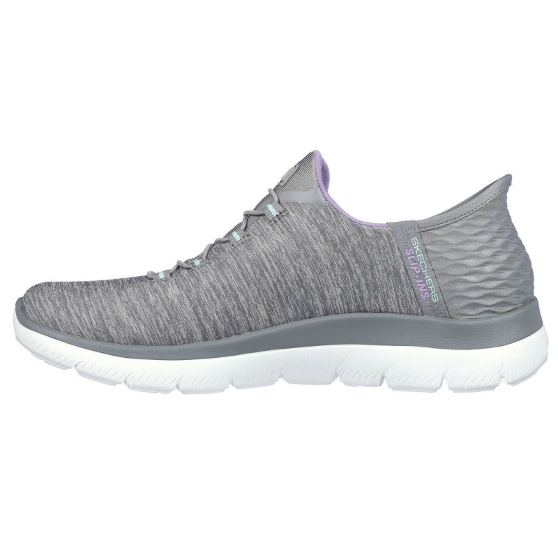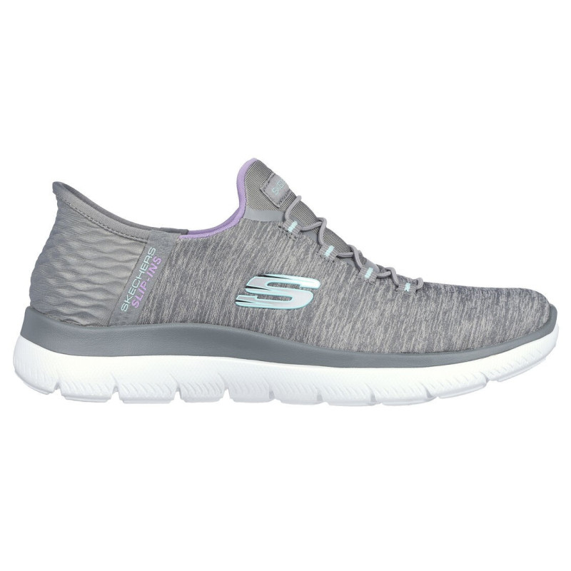 Zapatillas Skechers Slips-ins Summits para mujer. Parte superior de tejido de textil jaspeado de knit suave Cordones elásticos fijos en la parte delantera Plantilla con amortiguación Skechers Air Cooled Memory Foam®. Diseño exclusivo Heel Pillow™, que mantiene el pie en su sitio de forma segura. Fáciles de poner sin necesidad de agacharse y sin tocar las zapatillas. Se pueden poner de pie o sentado. Lavables a máquina. ¡Introduce el pie y listo!