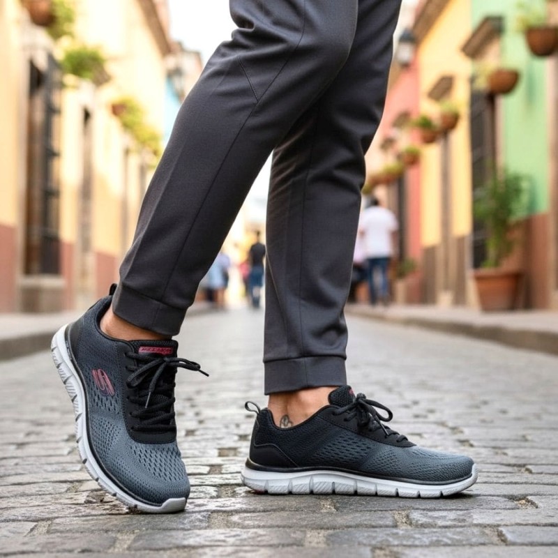 Mantén la comodidad y el estilo atlético en tus sesiones de entrenamiento con la zapatilla Skechers Track. Zapatilla deportiva con cordones, parte superior de piel lisa, piel sintética y malla con plantilla confort SKECHERS Memory Foam con amortiguación. Colores como en las fotografias, marino y el negro es gris. Calce muy ligero y comodo.