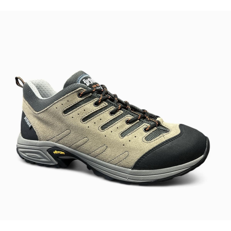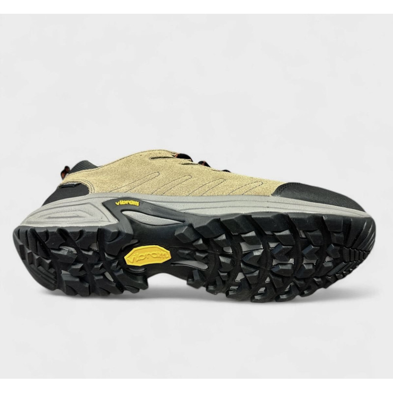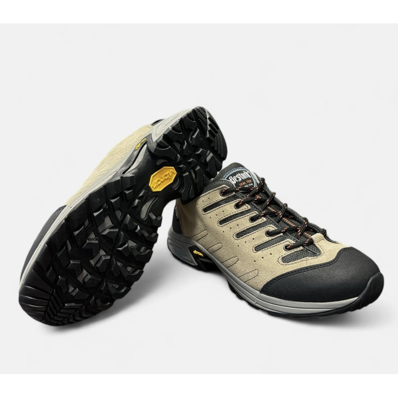 Deportiva tipo trekking para hombre de máxima calidad, fabricada en Arnedo, La Rioja. Confeccionada en piel nobuk color amarillo camel, tejido negro en trasera y detalle en puntera de protección negro. Membrana impermeable Notton-Tex de alta calidad donde nos mantiene el pie seco y sin humedad. Suela de caucho natural antideslizante de taco con agarre. Ideal para caminatas por senderos de piedras y tierra. Plantilla antibacteriana preformada-. Calce de talla normal. Hecho en La Rioja.