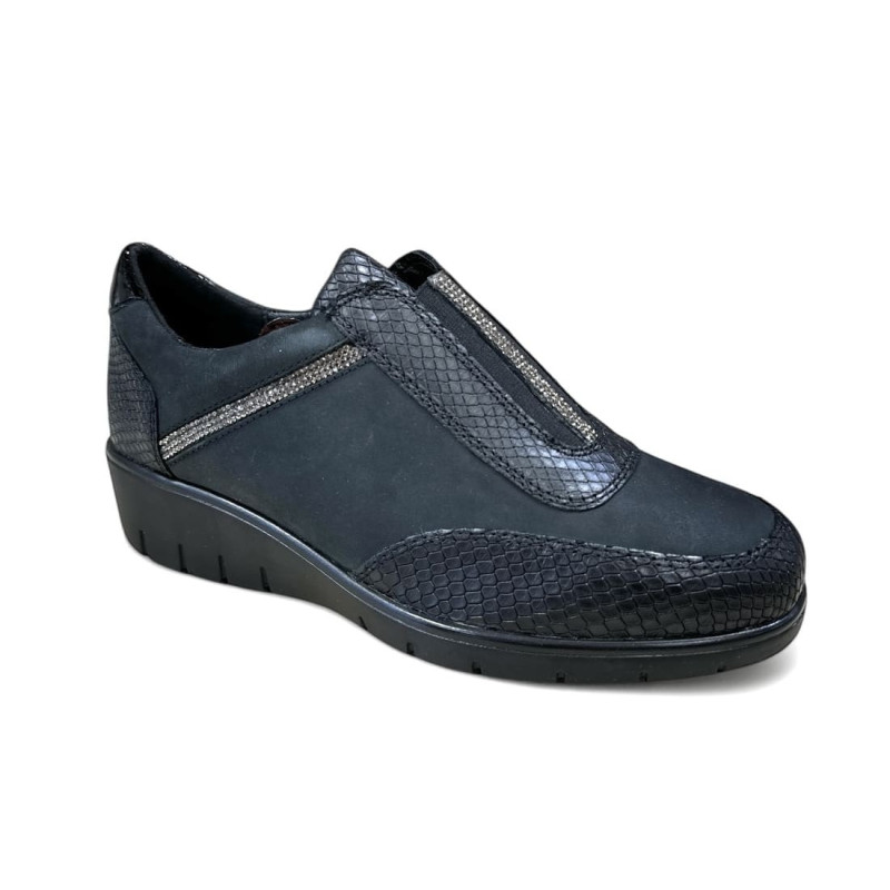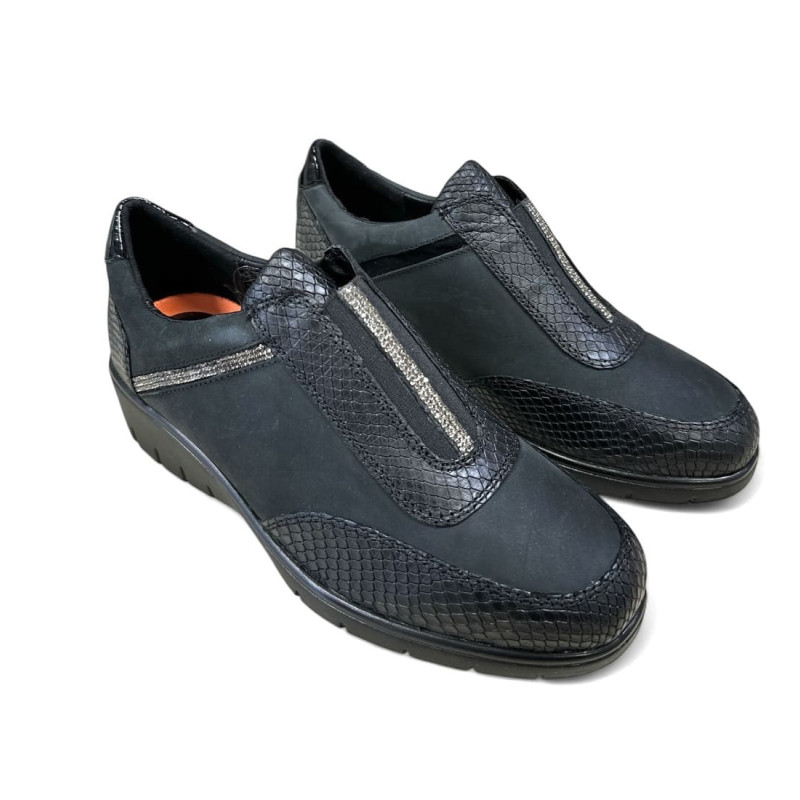 Zapatos mocasines de piel escote elástico asimétrico de la marca Riojana Notton para mujer con pies delicados. Confeccionado en tres tipos de piel y dos colores. Suela con cuña ligera y cómoda para invierno. Plantillas extraíbles con otras de regalo que rellenan y hacen que el calce ajuste más. Calce de talla habitual, si tienen duda consultenos.