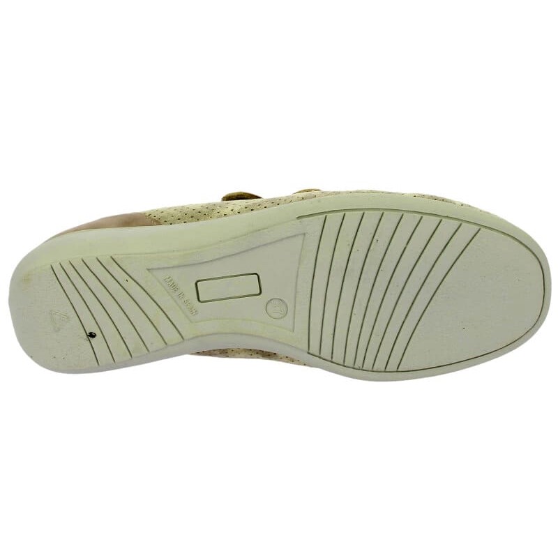 Zapato tipo Mercedes para mujer de la marca riojana Pitillos. Fabricado en piel vacuno color crema y tejido enrejillado fresco con algo de brillo dorado. Calce donde podemos recoger todo el piel y ajustarlo mediante un velcro en el empeine, opción de quitar la plantilla y poner otra. Suela muy ligera, antideslizante dando seguridad en cada paso. Calce de talla normalmente el habitual. Hecho en La Rioja. Comodidad para esta primavera.