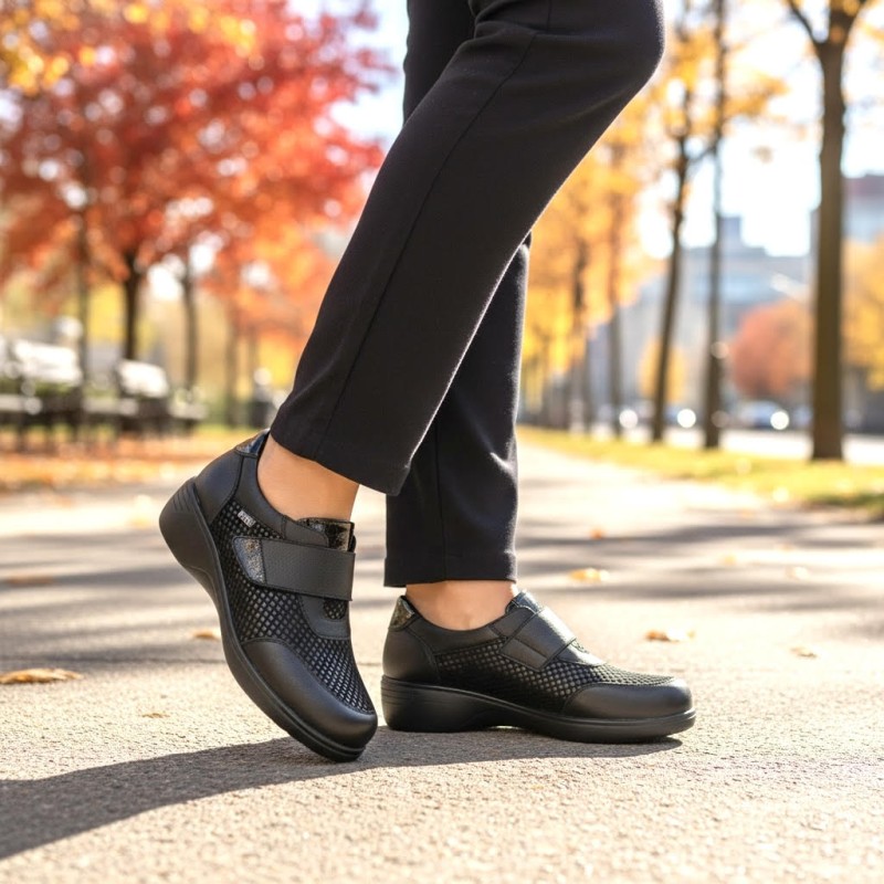 Zapato estilo sport para mujer con pie delicado. Fabricado en La Rioja por la marca Pitillos. Confeccionado con piel napa y licra estampada grabada. Sistema de cierre mediante velcro para un mejor ajuste del empine. Plantilla extraíble y transpirable. Suela de poliuretano muy ligera de 3 cm de grosor. Calce talla habitual. Hecho en España.