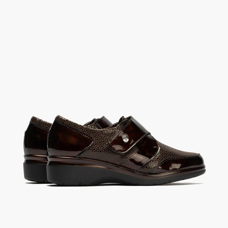 Zapato comodo ancho especial fabricado en La Rioja. Confeccionado en piel charol muy blandita de invierno que se adapta a juanetes o a la a anchura del piel sin dolor. Detalles en la pala lo que le dan un aspecto mas moderno dentro de un calzado confort. Los zapatos mas cómodos para el día a día. Sistema de cierre velcro muy duradero. Suela muy ligera y gordita aislante del frio totalmente antideslizante. Forro de invierno termico muy suave- En el interior recibirá dos pares de plantillas para adaptarlo mejor a su horma. Calce talla habitual. Plantilla transpirable extraíble. Hecho en España.
