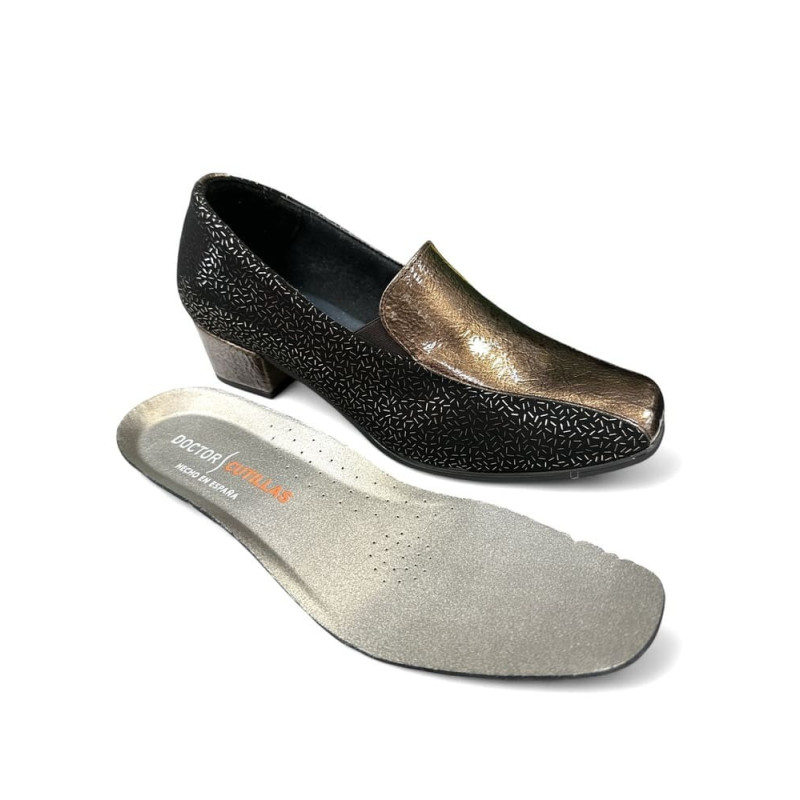 Zapato de vestir DOCTOR CUTILLAS ANCHO ESPECIAL. Fabricado en piel charol y lycra con incrustaciones de cristales en la pala. Plantilla extraíble y tacón medio. Calce ancho y largo generoso casi una talla de ! ULTIMAS TALLA !