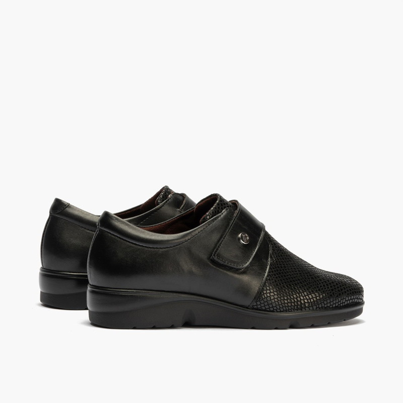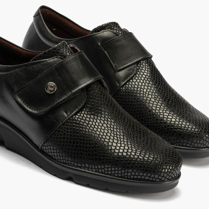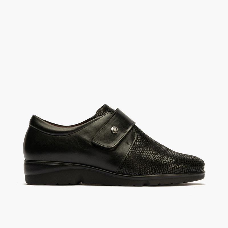 Uno de los zapatos mas cómodos hechos en España, ancho especial fabricado en La Rioja. Confeccionado en piel charol lisa, coco y napa color gris de invierno que se adapta a juanetes o a la a anchura del piel sin dolor. Detalles en la piel lo que le dan un aspecto mas moderno dentro de un calzado confort. Los zapatos mas cómodos para el día a día. Sistema de cierre velcro muy duradero. Suela muy ligera y gordita aislante del frio totalmente antideslizante con algo de plataforma delantera para no cargar los metatarsos. En el interior recibirá dos pares de plantillas para adaptarlo mejor a su horma. Calce talla habitual. Plantilla transpirable extraíble. Hecho en España. Producto de continuidad.
