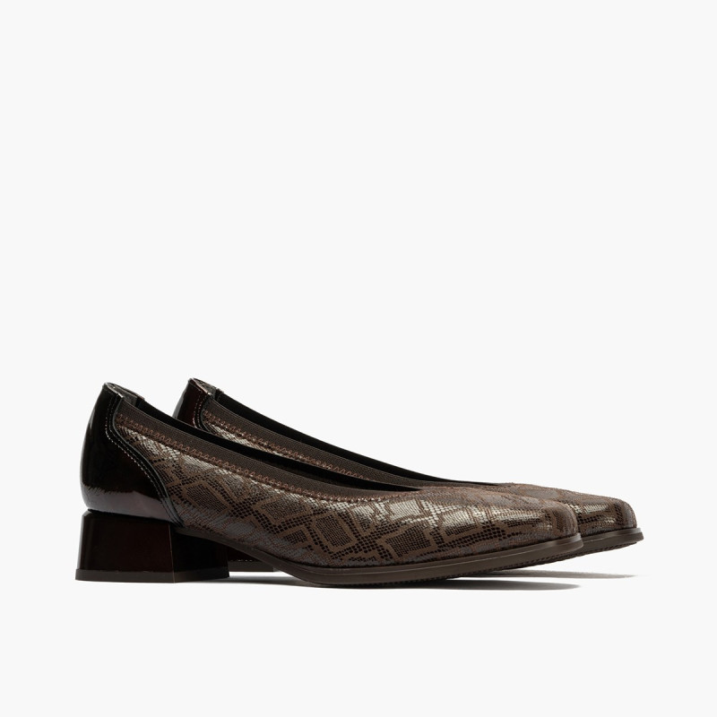 Los mejores Zapatos tipo salón elegantes de mujer con adorno en la pala, fabricado en piel con forro térmico. Combinación equilibrada de materiales diferentes que combinan elegantemente y forman un diseño atractivo y cómodo. Plantilla extraíble. Color burdeos tipo charol. Tacón cuadrado bajo muy cómodo. Talla habitual. Hecho en España.