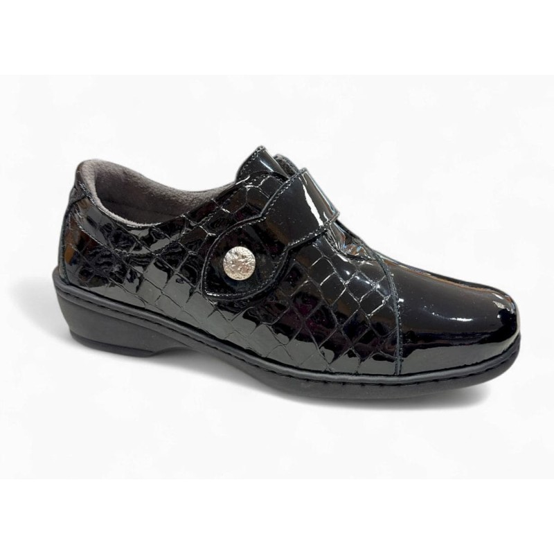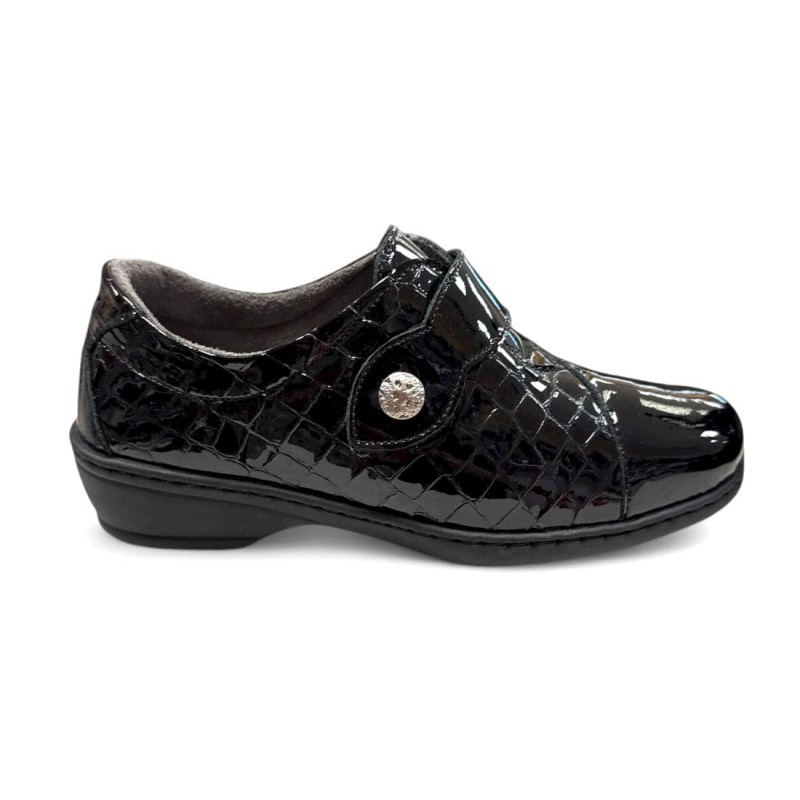 Zapato sport Ancho especial fabricado en La Rioja. Confeccionado en piel charol y lo mas importante lycra de invierno que se adapta a juanetes o a la a anchura del piel sin dolor. Detalles en la pala lo que le dan un aspecto mas moderno dentro de un calzado confort. Los zapatos mas cómodos para el día a día. Sistema de cierre velcro muy duradero. Suela muy ligera y gordita aislante del frio totalmente antideslizante. En el interior recibirá dos pares de plantillas para adaptarlo mejor a su horma. Calce talla habitual. Plantilla transpirable extraíble. Hecho en España.