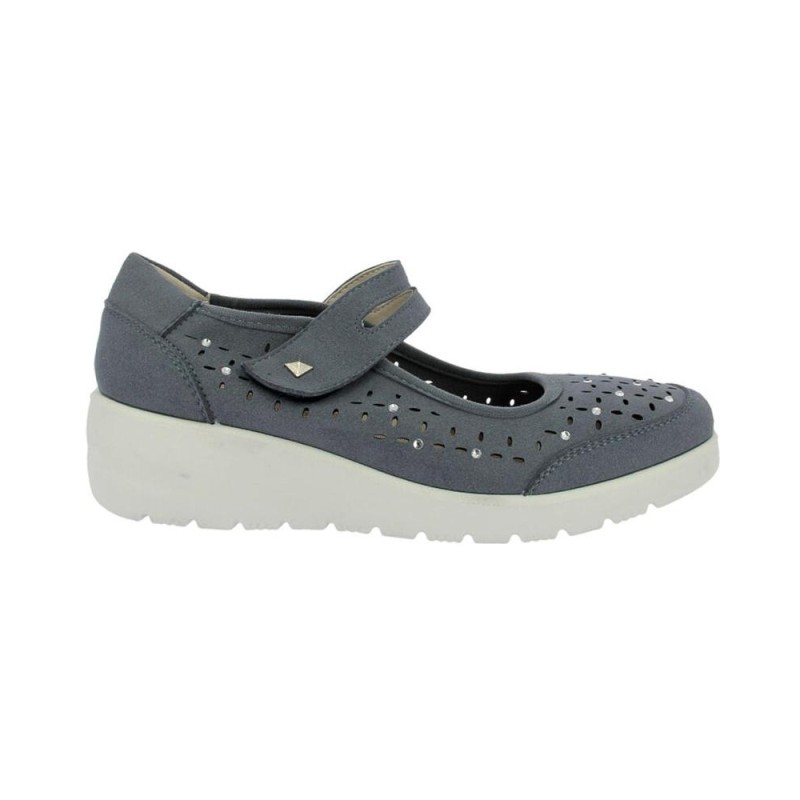 Zapato estilo Mercedita para mujer de la marca española Doctor Cutillas. Fabricada en piel metalizada con aguas, detalles tipo serpiente en color gris en los laterales. Con aberturas laterales en su trasera acabada en dos elásticos pequeños en el talón para un mejor ajuste al andar. Velcro en el empeine fino. Recomendamos poner bien atrás el piel al calzarlo y ajustar bien el velcro. Plantilla acolchada extraíble para poder meter ortopédica. Suela de goma antideslizante y de planta ancha, recomendado para pies delicados. El soporte elástico lateral ayuda y mejora el ajuste del pie Hecho en España. Calce amplio.