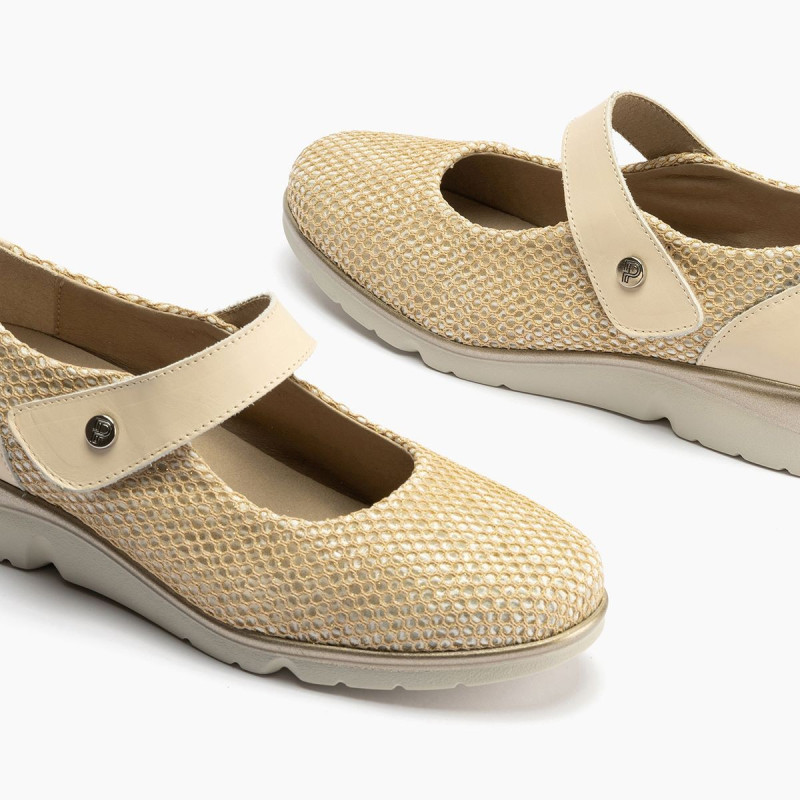 Zapato tipo Mercedes para mujer de la marca riojana Pitillos. Fabricado en piel vacuno color crema y tejido enrejillado fresco con algo de brillo dorado. Calce donde podemos recoger todo el piel y ajustarlo mediante un velcro en el empeine, opción de quitar la plantilla y poner otra. Suela muy ligera, antideslizante dando seguridad en cada paso. Calce de talla normalmente el habitual. Hecho en La Rioja. Comodidad para esta primavera.