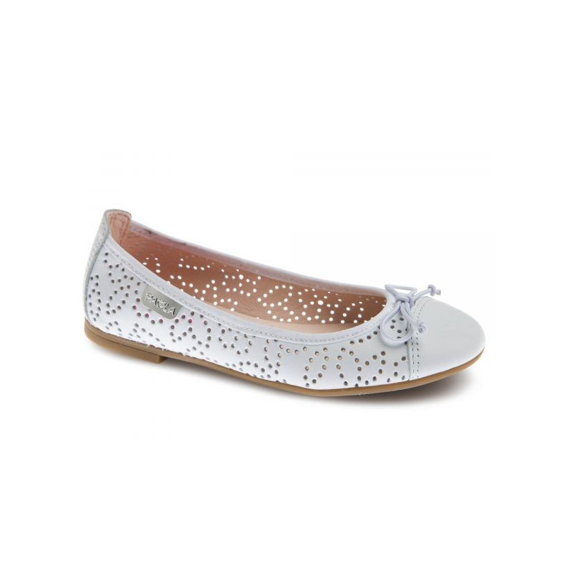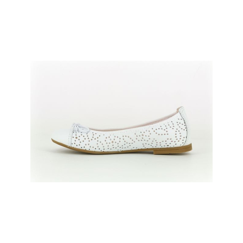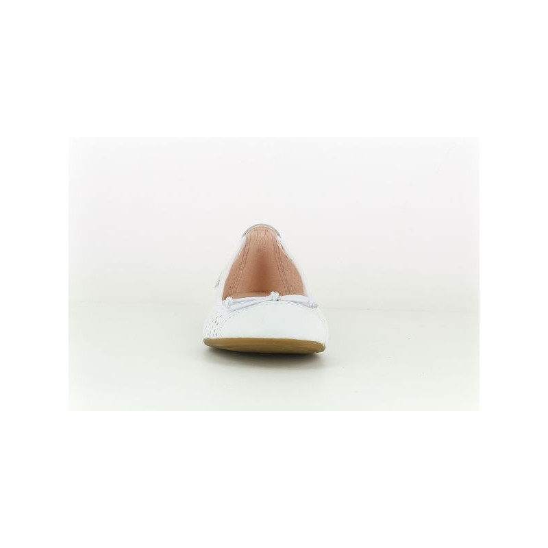 Mercedes Sabrina de la marca nacional PABLOSKY. Color blanco con mezcla de plata, calado en la piel con láser. Sistema de ajuste con velcro en el empeine. Zapato de diseño intemporal que le acompañará en múltiples situaciones. Comodidad, durabilidad y versatilidad de un calzado 100% español
